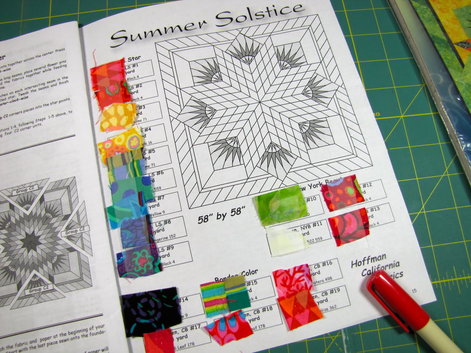 Over the past few days I have been selecting fabrics for a new project. In less than a month, I will be attending a Judy Niemeyer Retreat in Montana and I will be starting one of her newer patterns, Summer Solstice. (Pssst... there are only 2 still in stock)